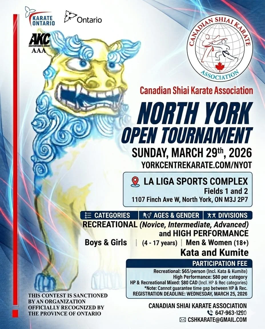 Final draws and approximate timetable will be published on this website https://yorkcentrekarate.com/nyot/ not later than Thursday, March 26, 2026, 11.00 pm, last change in the draws can be made only by Friday, March 27, 2026, 10.00 pm (no changes can be made after that time or onsite). ADDITIONAL NOTE: The participation in HP and Recreational division of the same type is not allowed, the only exception is if athletes participate in HP Kata division and want to participate in Advanced or Intermediate Kumite instead, or other way HP Kumite and Advance or Intermediate Kata, that can be allowed.